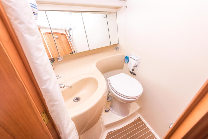 Moving aft again through the saloon and you come to the fantastic owners cabin. On the way into the cabin you pass loads of storage space. The owners cabin has a large island bed with storage both to port and starboard. You will also find that this cabin also has a separate head and shower cubicles.