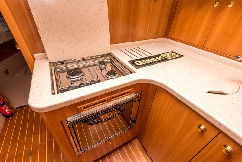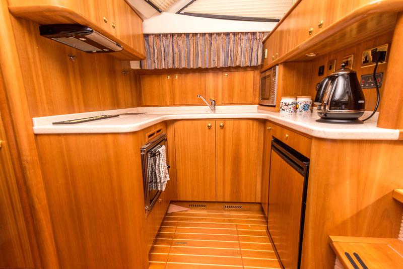 Down the stairs into the saloon is another fantastic space and moving forward you drop down into the galley. Here you will find a gas oven and hob (including extractor fan), microwave, fridge and dual sink to starboard with a good eating area to port.